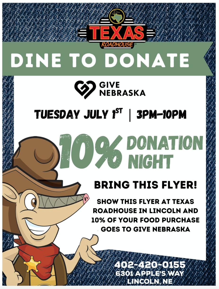 We’re excited to invite you to our "Dine to Donate" night at Texas Roadhouse on July 1!